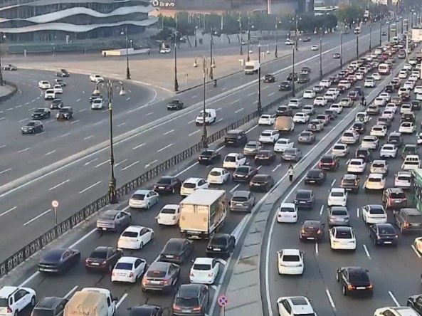 Bakının bir sıra yollarında nəqliyyat sıxlığı yaranıb.