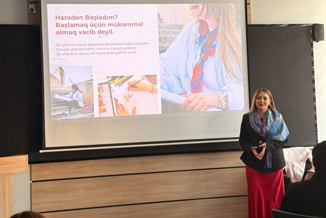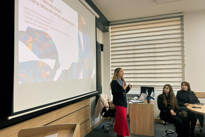 Təlimçi Sevil Əhmədova isə şəxsi yaradıcılıq yolundan, “Sevil Art” brendinin formalaşma mərhələlərindən söz açıb. O, qarşılaşdığı çətinlikləri, qlobal bazarda tanınmaq üçün atdığı addımları, beynəlxalq sərgilərdə iştirakın əhəmiyyətini və məhsulların xaricdə təqdimat strategiyalarını tələbələrlə bölüşüb. Azərbaycan brendinin dünyaya çıxarılması istiqamətində praktiki nümunələr təqdim edib.