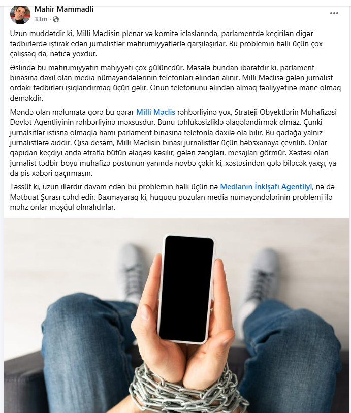 Jurnalist həmçinin, bu qərarın Milli Məclisin rəhbərliyinə yox, Strateji Obyektlərin Mühafizəsi Dövlət Agentliyinin rəhbərliyinə aid olduğunu açıqlayıb. Mahir Məmmədli bildirib ki, telefonların alınması təhlükəsizliklə əlaqəli deyil, çünki jurnalistlər istisna olmaqla, digər bütün şəxslər parlament binasına telefonla daxil ola bilir. “Bu qadağa yalnız jurnalistlərə aiddir. Qısa desəm, Milli Məclisin binası jurnalistlər üçün həbsxanaya çevrilib. Onlar qapıdan keçdiyi anda ətrafla bütün əlaqələri kəsilir, gələn zəngləri, mesajları görmür”, – jurnalist vurğulayıb.