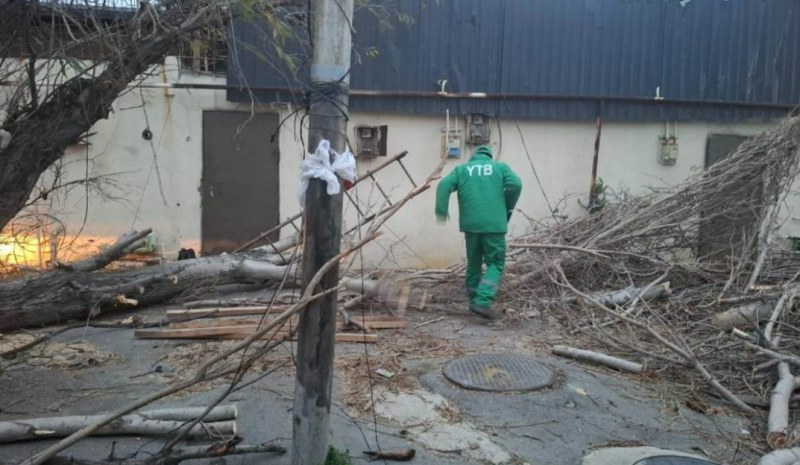 Bakı Şəhər Yaşıllaşdırma Təsərrüfatı Birliyinin əməkdaşları sınan ağac və qırılan budaqları götürərək ərazini təmizləyirlər.