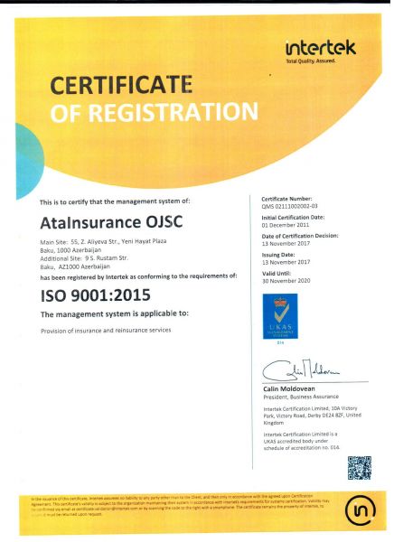 “AtaSığorta” ASC növbəti 3 il müddətinə “Intertek”  şirkəti tərəfindən yeni ISO 9001:2015 beynəlxalq sertifikatına layiq görülmüşdür. Şirkət 2005-ci ildən fəaliyyətini Beynəlxalq Standartlaşma Təşkilatının (ISO) keyfiyyət idarəetmə sisteminin tələbləri əsasında həyata keçirir.