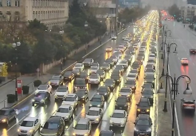 Bakının bir sıra yollarında nəqliyyat sıxlığı yaranıb.