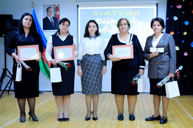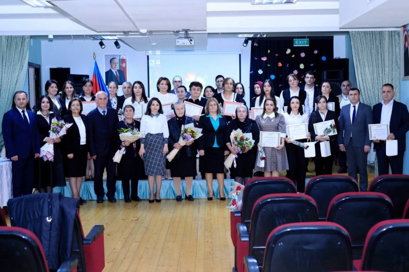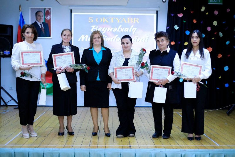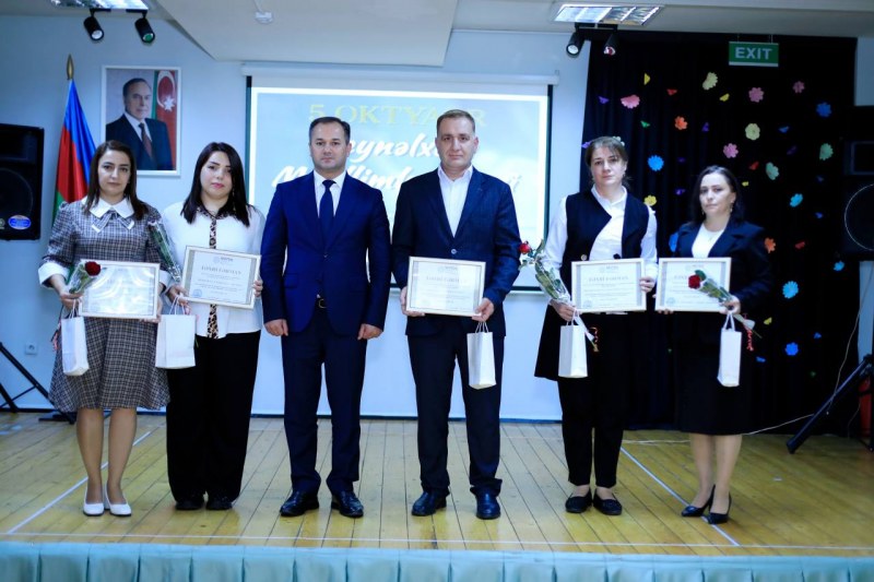 Daha sonra bir qrup müəllimə təhsilin inkişafındakı xidmətlərinə, gənc nəslin təlim-tərbiyəsi sahəsində yüksək naliyyətlər əldə etdiklərinə görə və 5 oktyabr-Beynəlxalq Müəllimlər Günü münasibətilə Azərbaycan Respublikasının elm və təhsil naziri cənab Emin Əmrullayevin müvafiq əmri ilə verilmiş "Azərbaycan Respublikası qabaqcıl təhsil işçisi" döş nişanı, Elm və Təhsil Nazirliyinin Fəxri Fərmanı, Şəki -Zaqatala Regional Təhsil İdarəsinin Fəxri Fərmanı və ETİHİ-nin Şəki Şəhər Komitəsinin hədiyyələri təqdim olunub.