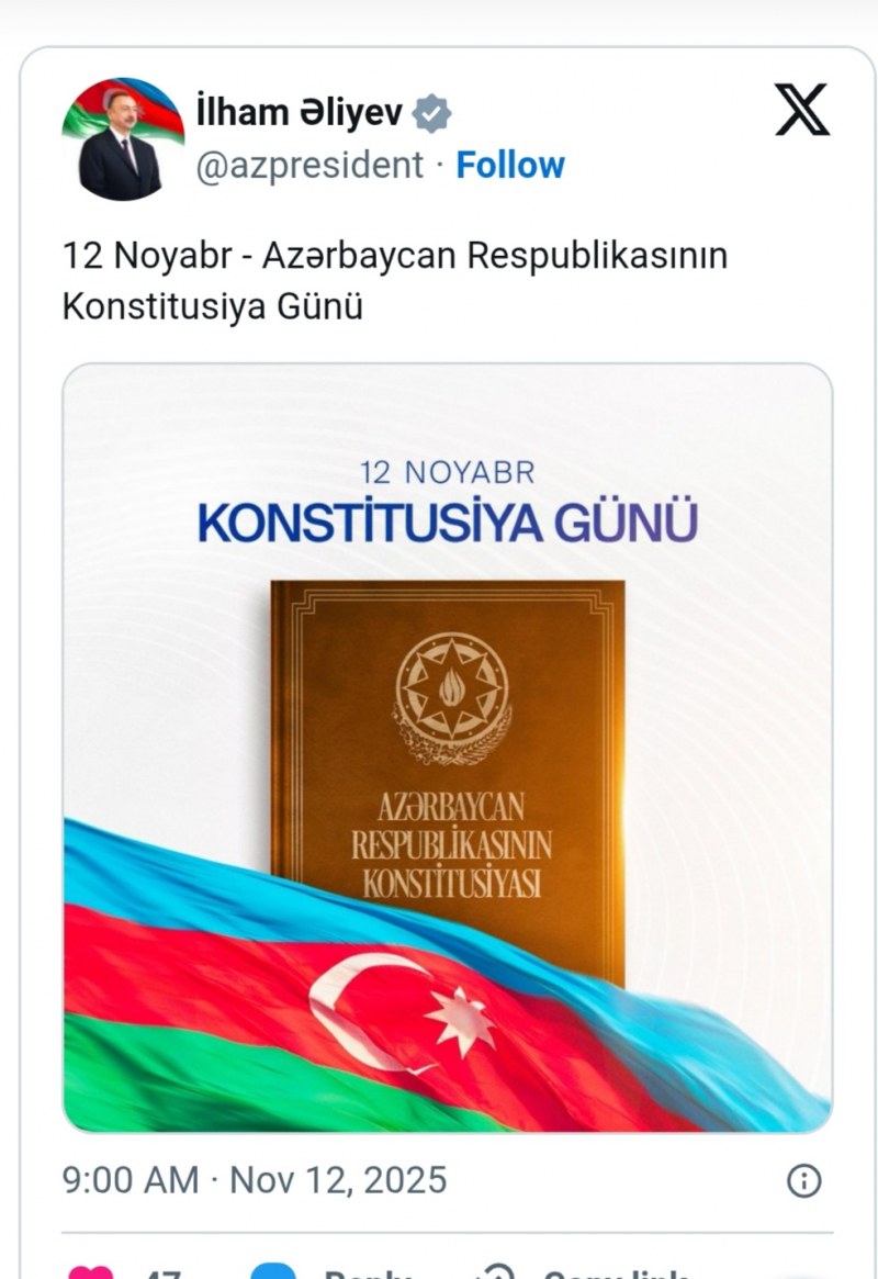Prezident İlham Əliyev 12 Noyabr - Konstitusiya Günü ilə bağlı paylaşım edib.