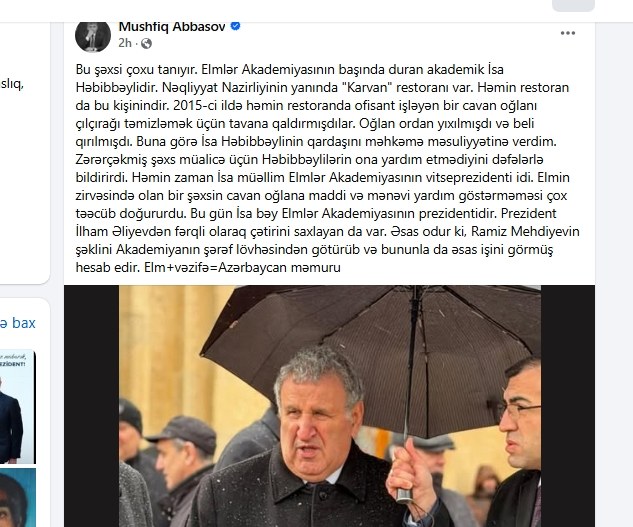 "2015-ci ildə həmin restoranda ofisant işləyən bir cavan oğlanı çılçırağı təmizləmək üçün tavana qaldırmışdılar. Oğlan ordan yıxılmışdı və beli qırılmışdı. Buna görə İsa Həbibbəylinin qardaşını məhkəmə məsuliyyətinə verdim. Zərərçəkmiş şəxs müalicə üçün Həbibbəylilərin ona yardım etmədiyini dəfələrlə bildirirdi. Həmin zaman İsa müəllim Elmlər Akademiyasının vitseprezidenti idi. Elmin zirvəsində olan bir şəxsin cavan oğlana maddi və mənəvi yardım göstərməməsi çox təəcüb doğururdu. Bu gün İsa bəy Elmlər Akademiyasının prezidentidir. Prezident İlham Əliyevdən fərqli olaraq çətirini saxlayan da var. Əsas odur ki, Ramiz Mehdiyevin şəklini Akademiyanın şərəf lövhəsindən götürüb və bununla da əsas işini görmüş hesab edir. Elm+vəzifə=Azərbaycan məmuru" - o əlavə edib.